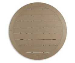 Raise the bar on outdoor living using this dining table with umbrella hole. Crafted for style, comfort and durability, this outdoor entertainment table caters with a standout two-tone finish that pairs a light driftwood-look and black finish for twice the interest. The round table design keeps everyone in the flow of conversation.