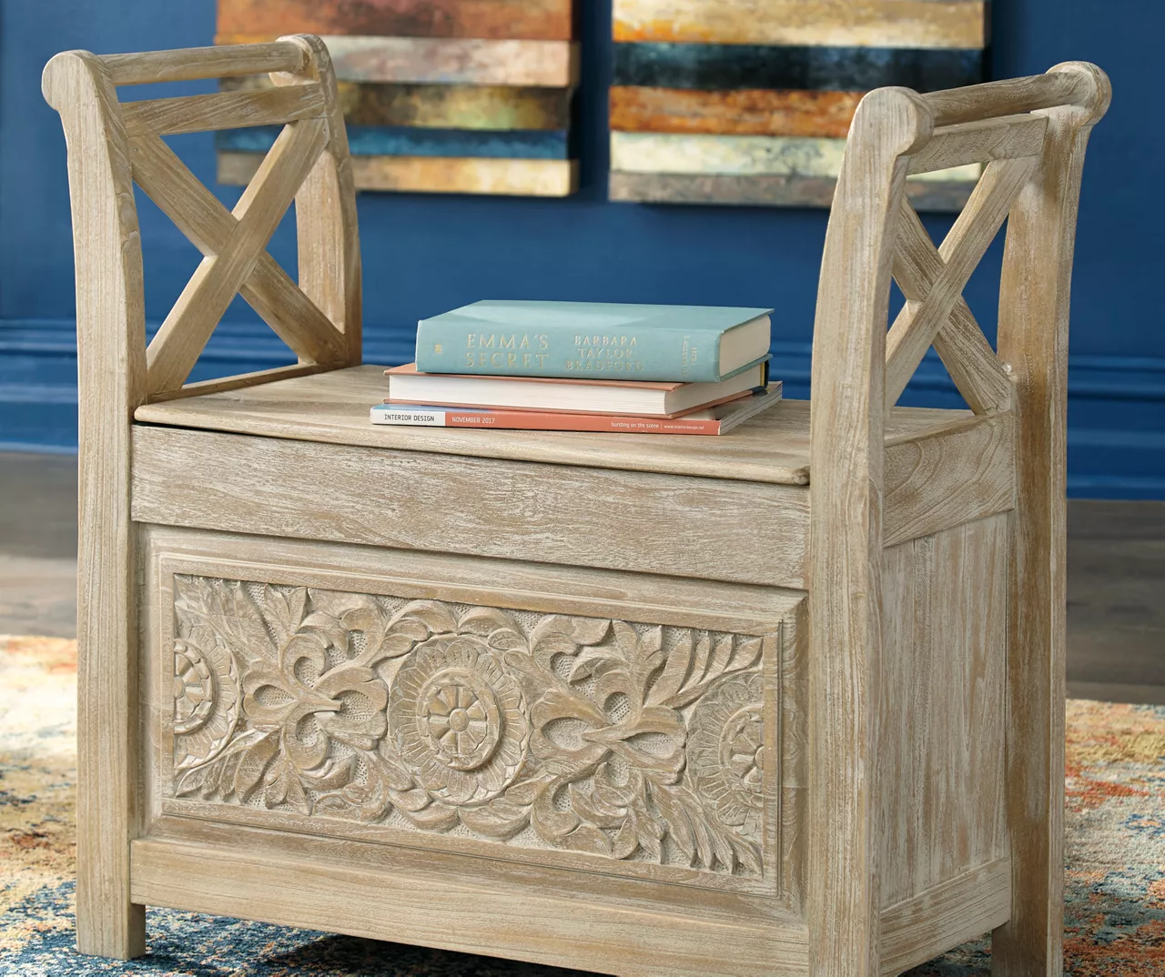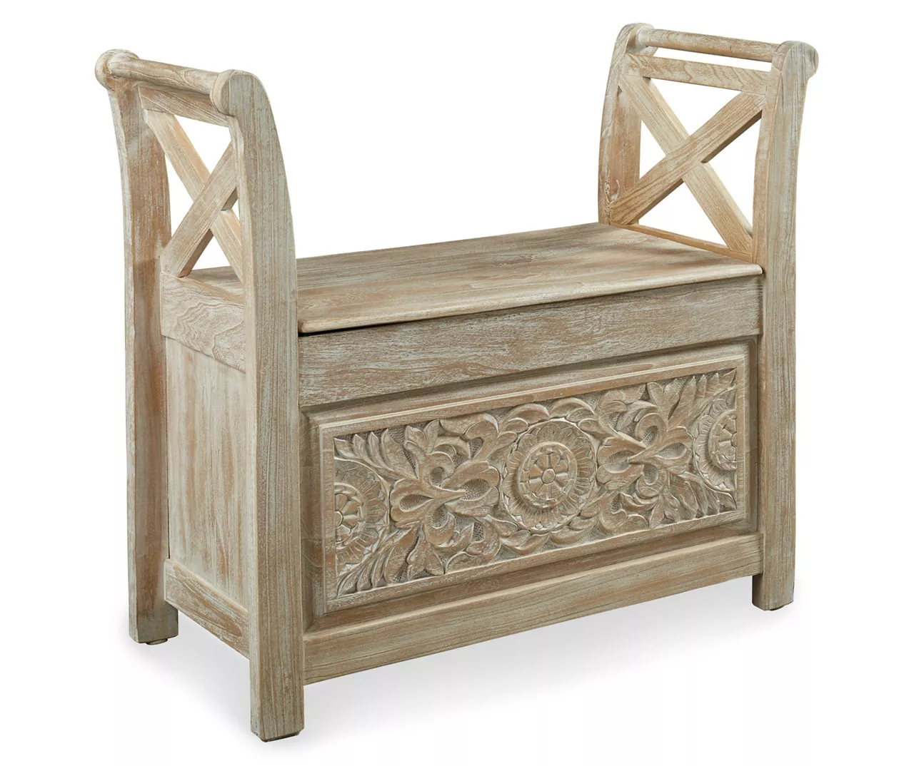 Get a dose of bohemian bliss with this accent bench. The whitewashed wood finish fits in effortlessly with your existing décor. A carved floral pattern beautifully covers the bottom front as X-design arms entice from above. Ready for more? Lift the seat for plenty of storage action underneath.