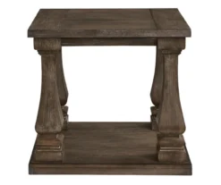 Homey. Hearty. Heavenly hued. Luring with a distressed weathered gray finish and square baluster legs set on a broad lower shelf for great presence, the Johnelle end table is sure to make your homestead feel that much more like home. The look is beautified with elm veneers and a framed and plank-effect tabletop for a richly crafted masterpiece made for years of satisfaction.